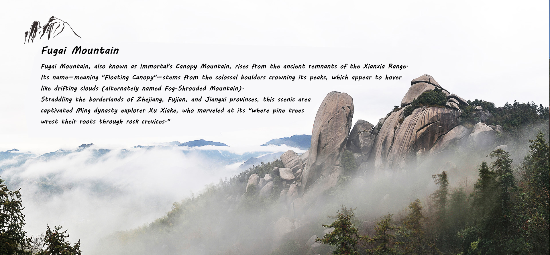 Fugai Mountain, also known as Guxian Mountain, is a National AAAA-level scenic area located at the junction of Zhejiang, Fujian, and Jiangxi provinces. Situated in the southern part of Nianbadu Town, Jiangshan City, Zhejiang Province, and northeast of Miaowan Village, Panting Township, Pucheng County, Fujian Province, it is accessible from both Zhejiang and Fujian sides within the ancient Xianxia Mountain range.